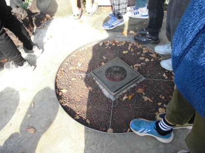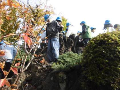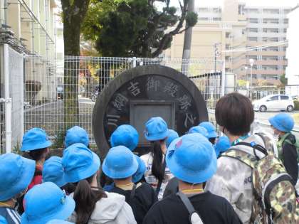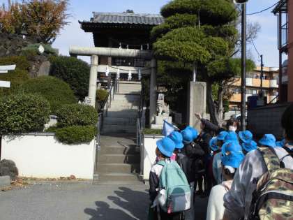 続いては、下練馬宿の町歩きです。現在の場所で言えば、東武練馬の手前あたりでしょうか。この辺りには、歴史を表す碑や富士塚などがあります。実際に記念碑を見たり富士塚に登ったりしながら、全身で学んでいきました。