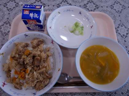 今日の給食は、油麩丼、かぼちゃの味噌汁、ずんだもち、牛乳でした。