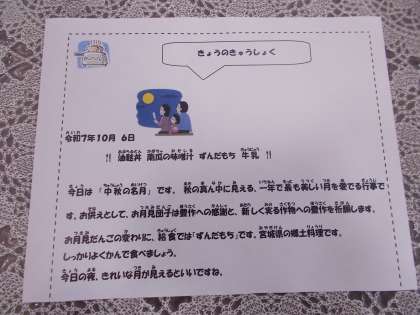 今日は、お月見団子の代わりに給食では「ずんだもち」です。宮城県の郷土料理です。枝豆の香りがして美味しくいただきました!