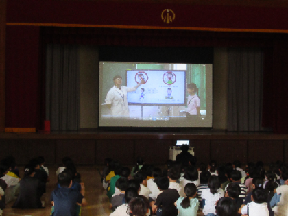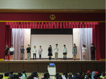 保健給食委員が、児童集会で「赤・黄色・緑の食材をバランスよく食べて健康になりましょう。」と、全校のみんなに呼びかけました。
