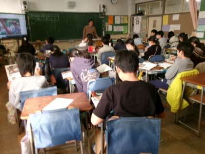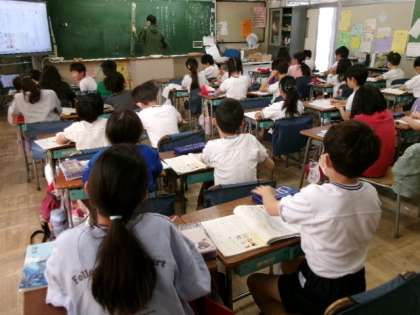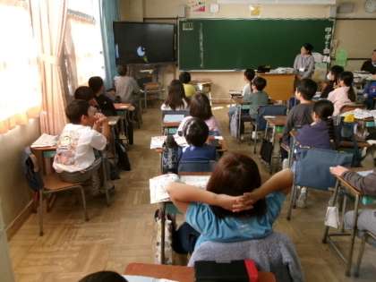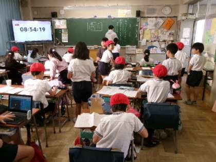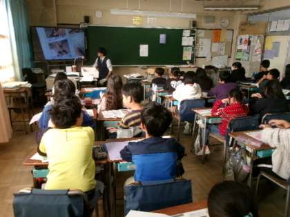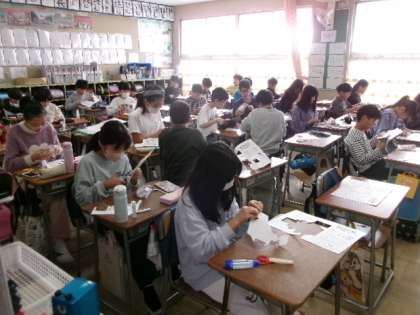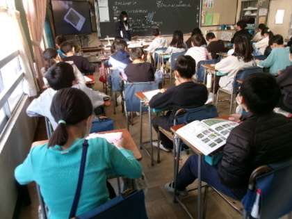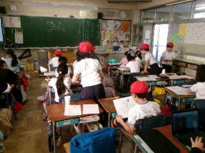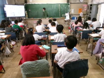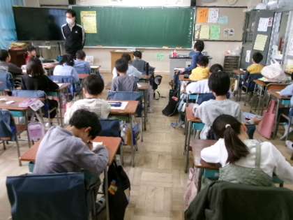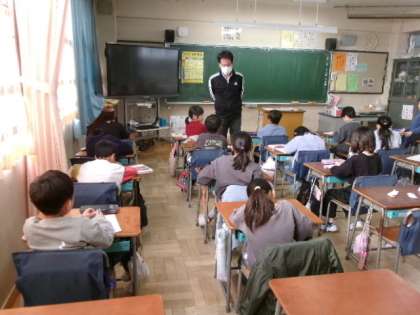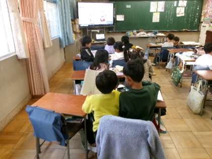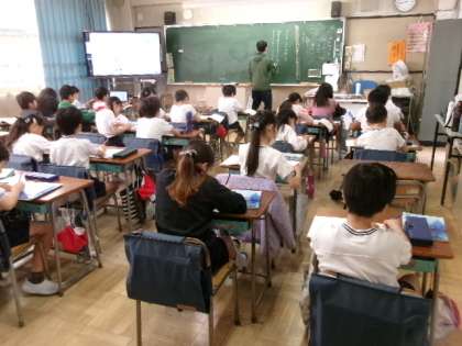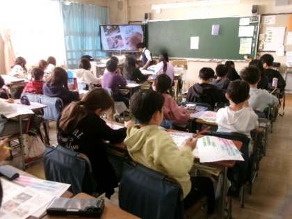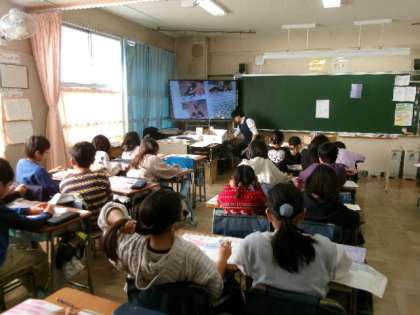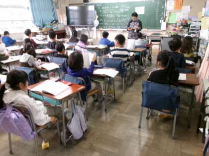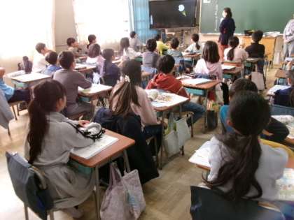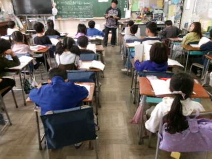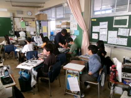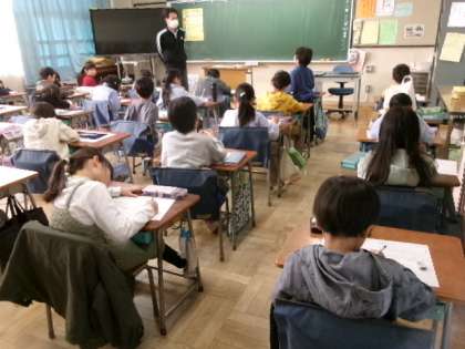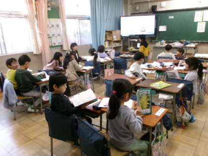 4年生の国語の時間には、工芸品について調べ、リーフレットにまとめる活動を行っています。まとめ方について確認しているところです。