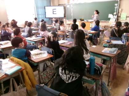 3年生の外国語活動の時間には、アルファベットに親しんでいます。アルファベットを当てるクイズをしながら文字の形を確認しています。