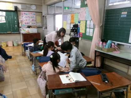 1年生の国語の時間には、友達と対話する活動をしています。隣の席の友達に自分の好きなものなどついて、伝え合っているところです。