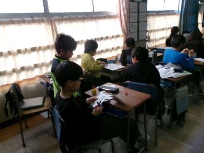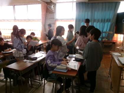 2年生の国語の時間には、各自でおもちゃの作り方の説明文を書いてきました。この時間には書いたものを互いに読み合い、感想を伝え合いました。