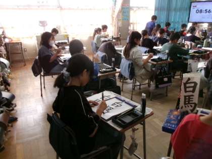 4年生の書写の時間には、漢字同士の大きさや文字の配列に気を付けながら「白馬」という文字を書いています。