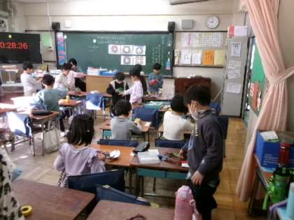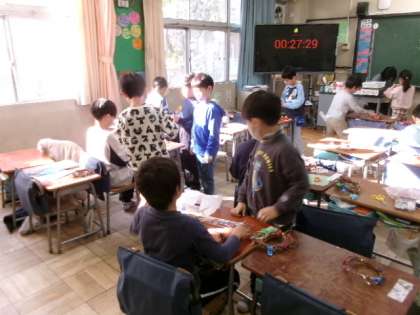 5年生の社会科の時間には、自動車生産に関わる人々について学習しています。この時間には実際に車の模型を作りながら自動車作りを体感しています。