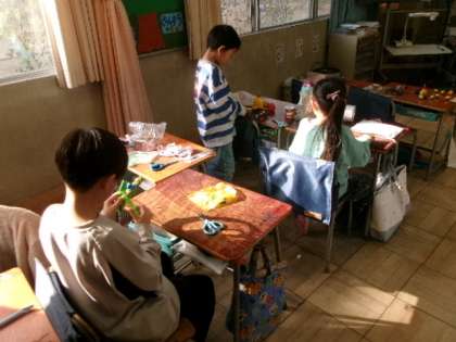 1年生は育ててきたアサガオのつるを束ねて、リースを作っています。飾り付けをしながらすてきに仕上げています。