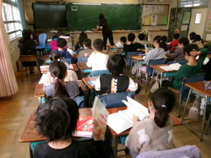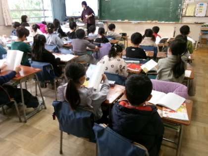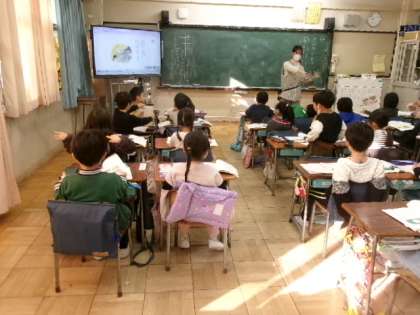 1年生の国語の時間には、「たぬきの糸車」という物語を読んでいます。初めに全体を読んで、この後、学習の見通しをつかんでいきます。