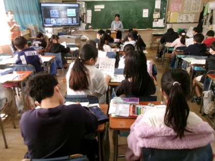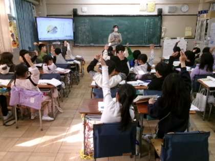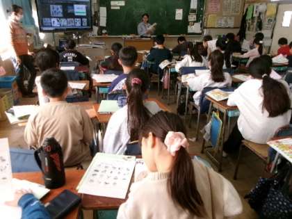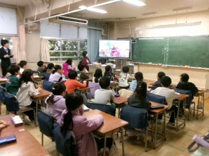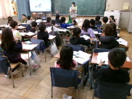 4年生の外国語活動の時間には、アルファベットに慣れ親しんでいます。身の回りにあるアルファベット文字について尋ねたり答えたりする活動も行っています。