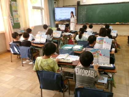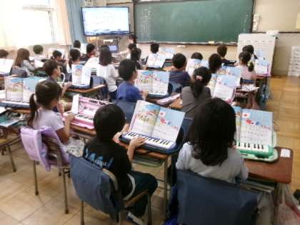 1年生の音楽の時間には、けんばんハーモニカにも取り組んでいます。音を出すときとやめるときの決まりも守りながら練習しています。