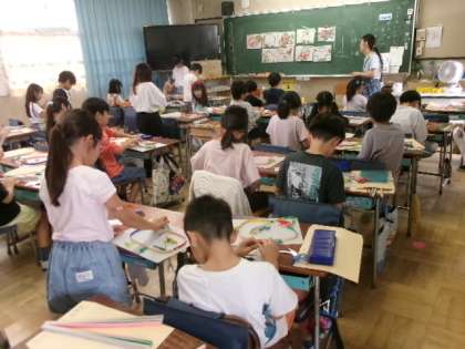 3年生の図工の時間には、色画用紙を使って鳥の形を表しています。カラフルな鳥がたくさん完成しそうです。