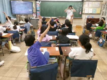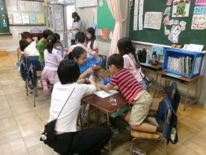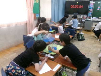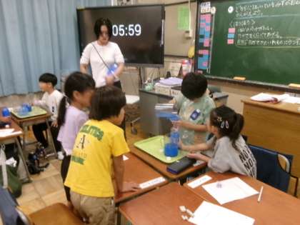 1年生の算数の時間には、水のかさについて学習しています。どちらの容器の水が多いかについて、実際に別の容器に移しかえて調べています。