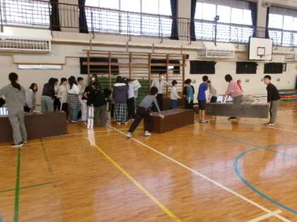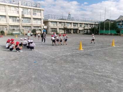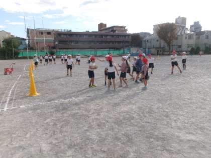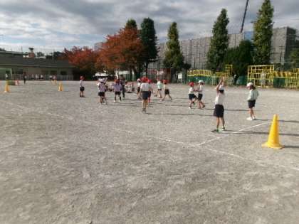 2年生の体育の時間には、ボール遊びに取り組んでいます。チームに分かれてコーンにボールを当てるゲームをしているところです。