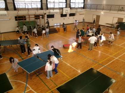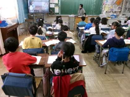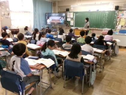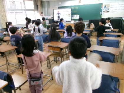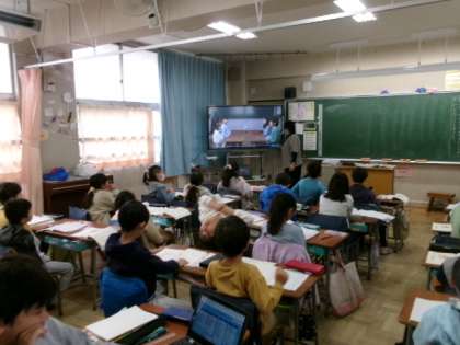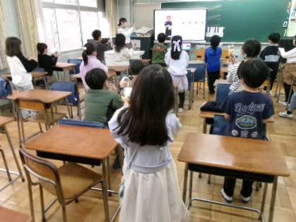 1年生の音楽の時間には、動画を見ながらまねっこをしてタンバリンでリズムを売っています。