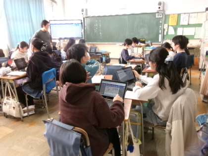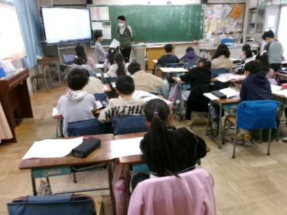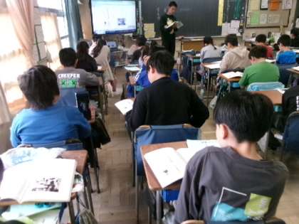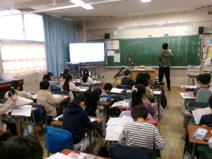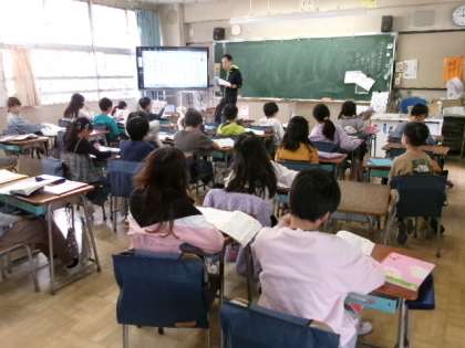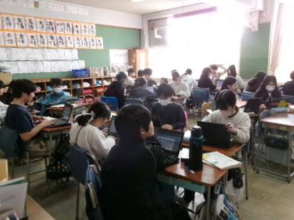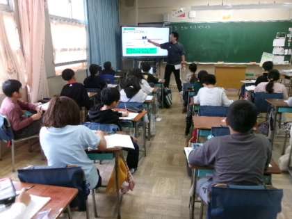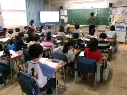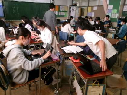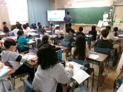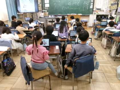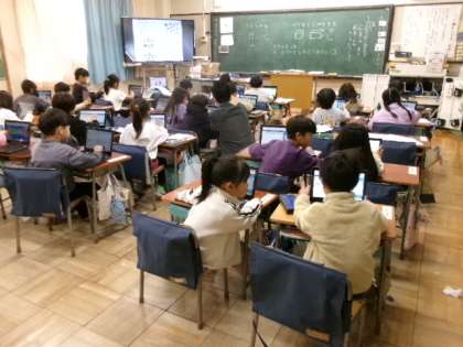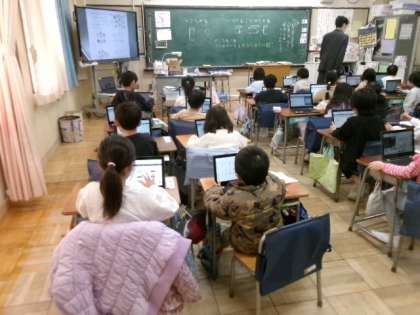 6年生の国語の時間には、鳥獣戯画に関する説明文を読んでいきます。初めに、タブレットで鳥獣戯画を見て気付いたことを出し合っています。