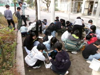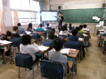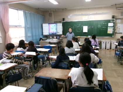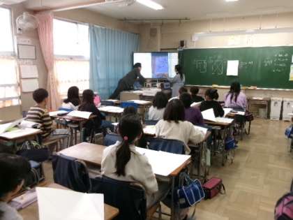 4年生の図工の時間には、招き猫をモチーフにした平面作品にとりかかります。初めに描き方の説明を聞き、イメージをふくらませています。