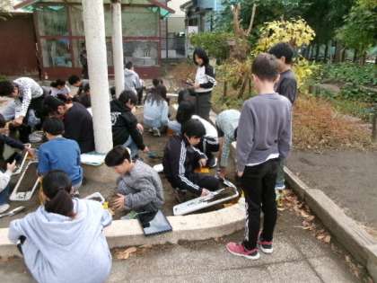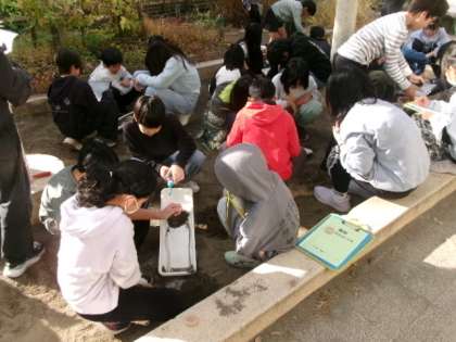 5年生の理科の時間には、流れる水のはたらきについて学習しています。この時間は砂場で水を流して実験をしています。