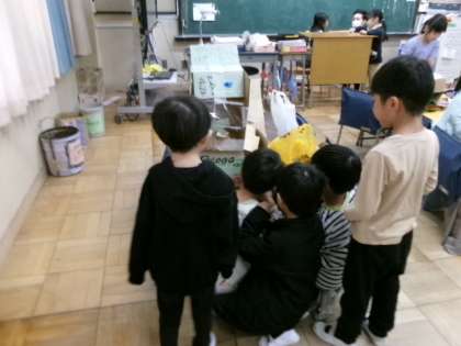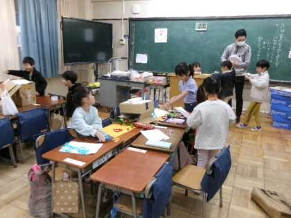 1年生の生活科の時間には、秋祭りを予定しています。秋祭りに向けてグループで準備をしています。