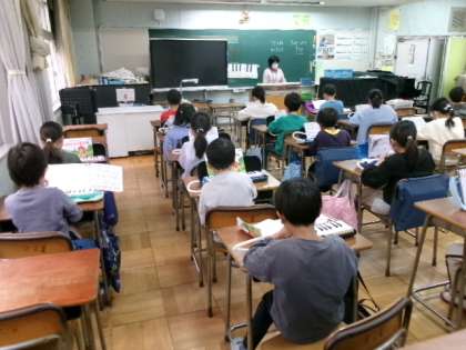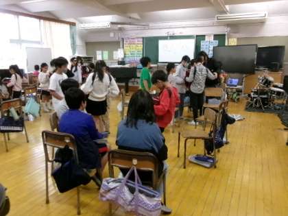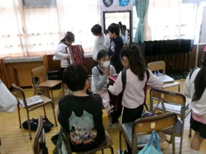 4年生の音楽の時間には、アコーディオンに挑戦しています。「かえるのうた」を交代で弾いています。