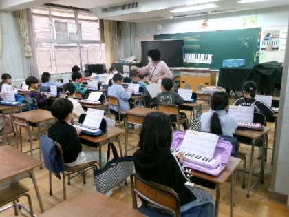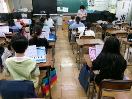2年生の音楽の時間には、けんばんハーモニカに取り組んでいます。「こぎつね」を弾いているところです。