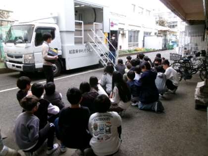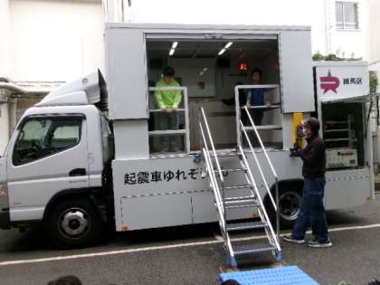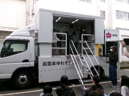避難訓練の後、5年生が起震車体験をしました。震度7までの揺れを体感しました。