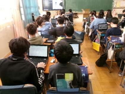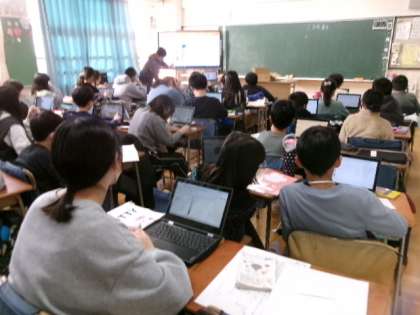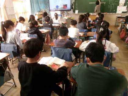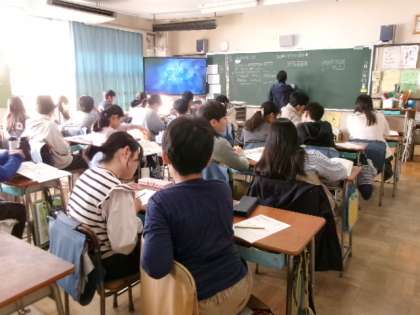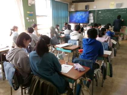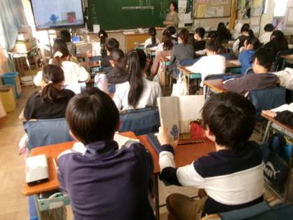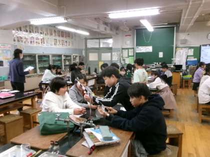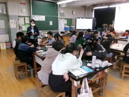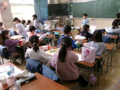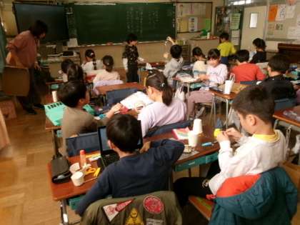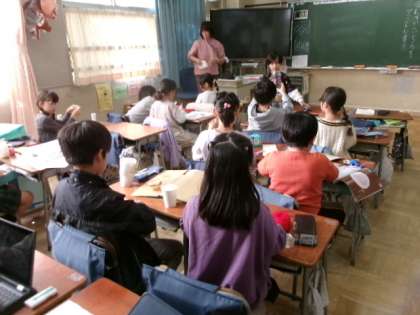 5年生の家庭科の時間にはウォールポケットを作ってきました。最後に、ウォールポケットに付ける飾りの作り方の説明を聞いています。