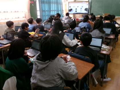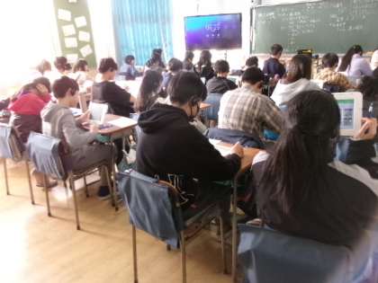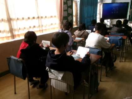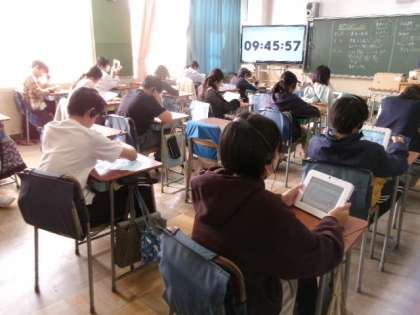 6年生は英語4技能検定に取り組みました。専用のタブレットとヘッドセットで、これまでの英語学習の成果を試しています。
