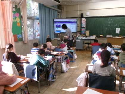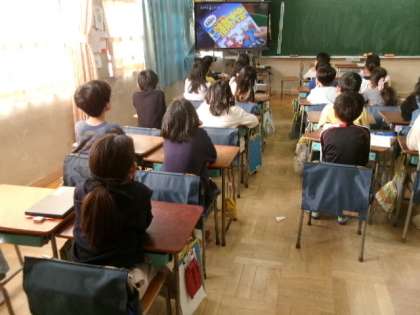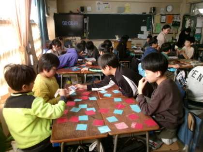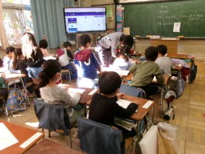 5年生の英語の時間の初めには、英語とイラストの書いてあるカードを使ってゲームをしながら、英単語に親しみました。
