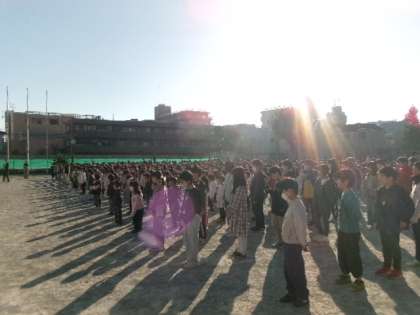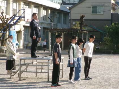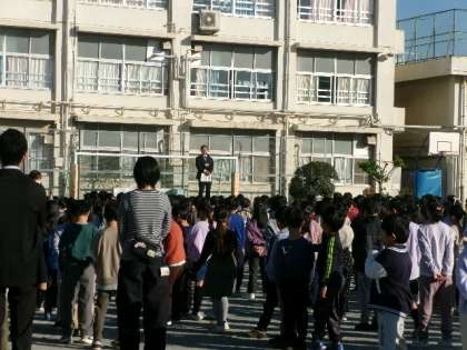 11月17日(月)の朝は、穏やかな日差しの下、校庭で全校朝会を行いました。6年生の代表児童の挨拶の後、校長先生からは展覧会に関するお話がありました。