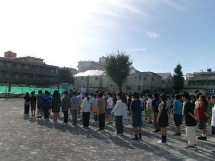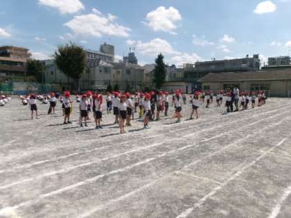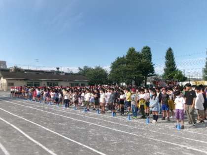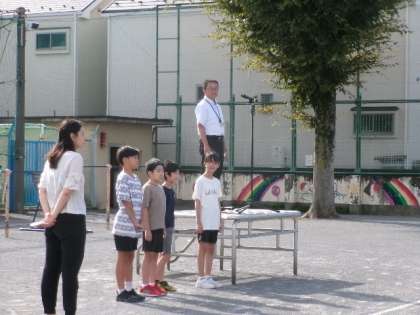 1学期末から暑さ対策のため全校朝会はリモートで行ってきましたが、9月22日(月)からは再び校庭で行います。上小スポーツフェスティバルまでは、プール側を向いて並びます。