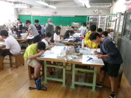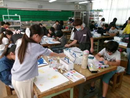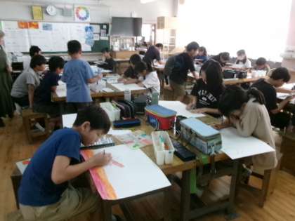 5年生の図工の時間には水彩画二取り組んでいます。この時間には、下描きした紙に丁寧に彩色しているところです。