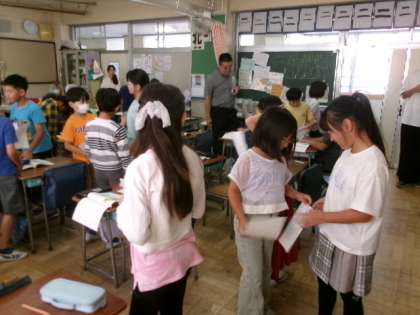 6年生の学級活動の時間には、グループワークトレーニングをしました。カードに書かれて手がかりを基に、宝の場所を探すゲームを、班で話し合いながら行いました。