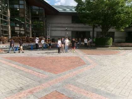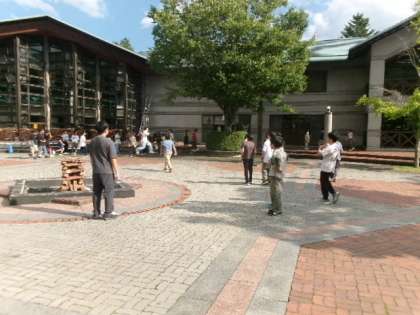 係ごとに分かれて打ち合わせをしたり、仕事を行ったりしています。キャンプファイヤー係と生活係の様子です。軽井沢も晴れ間は東京と変わらない気温です。水分補給しながらがんばっています。