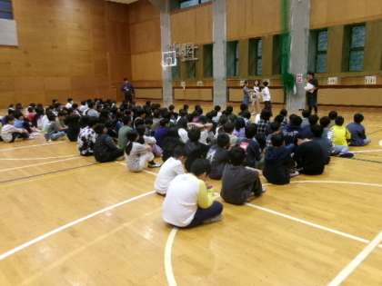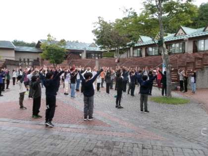 2日目の朝は中庭で朝会です。半袖だと少し肌寒い朝です。ラジオ体操で体を動かして目を覚ましました。5分間に集合することができました。さすが、上小の高学年です。