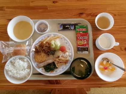 2日目の朝食です。バイキング方式で自分で食べられそうなものを選びます。すべて選ぶと写真のようになります。ポテトフライやフルーツポンチが人気でした。