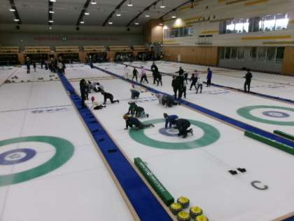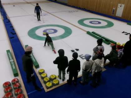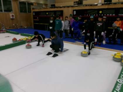 2日目の午前中は、カーリング体験です。初めに氷の上で転ぶ練習や滑る練習をしてから、実際にストーンを投げてみます。氷の上での動作は難しそうですが、貴重な体験ができました。