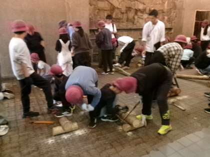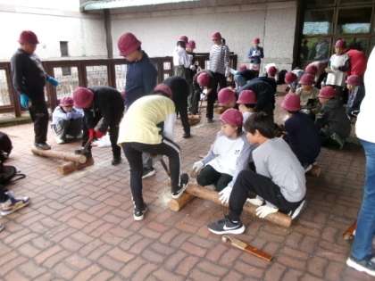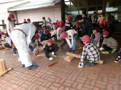 2日目の午後の活動は、林業体験です。宿舎の裏の林で行う予定でしたが、突然雨が降り出しましたので、宿舎の屋根のある所で、のこぎりでコースターや写真立てを作りました。