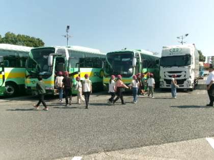 1時間以上バスに揺られて、上里サービスエリアでトイレ休憩です。道路の混雑もなくほぼ予定通りです。車内ではバスレクで盛り上がっています。