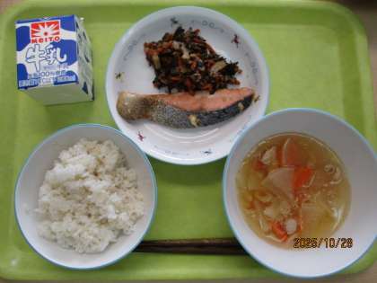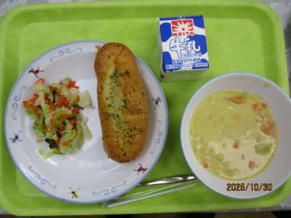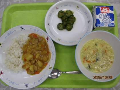 かぼちゃのたっぷり入ったかぼちゃシチューです。かぼちゃは、かぜを予防したり、体を病気から守る「ベーターカロテン」という栄養を含んだ緑黄色野菜です。シチューは体も温まり、寒い日にはピッタリです。