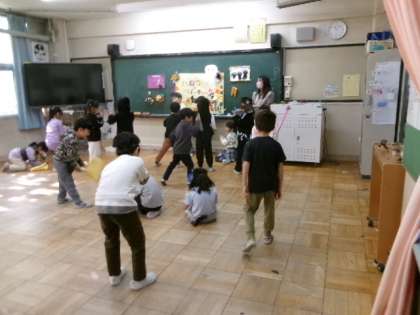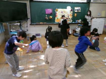 1年生のこの学級では、ハロウィンにちなんで、思い思いに仮装をしながら、みんなで決めたゲームをして楽しんでいます。