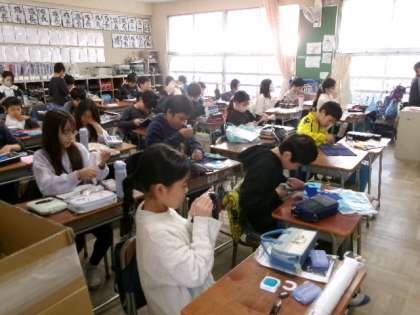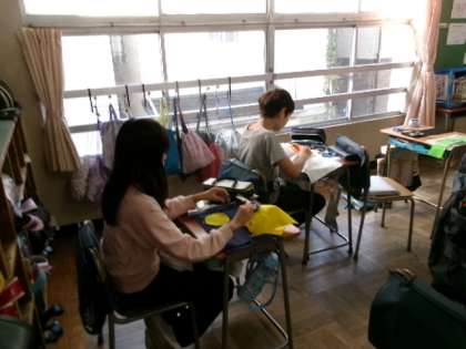 5年生の家庭科の時間には、ウォールポケットを作っています。本体に思い思いの飾りを縫い付けているところです。真剣に一針ごとに作業を進めています。