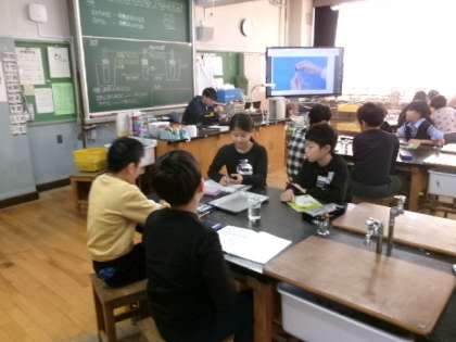 6年生の理科の時間には、てこのはたらきとしくみについて学習しています。てこの実験を基に気付いたことなどについて話し合っています。