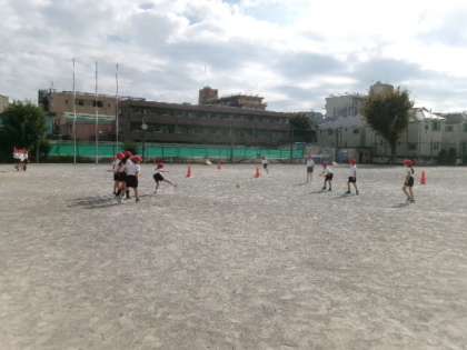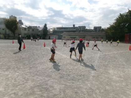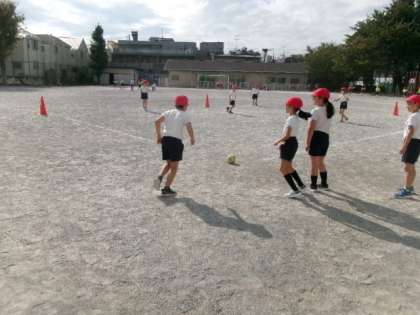 3年生の体育の時間には、キックベースボールに取り組んでいます。試しのゲームで、やり方やルールなどを確かめています。