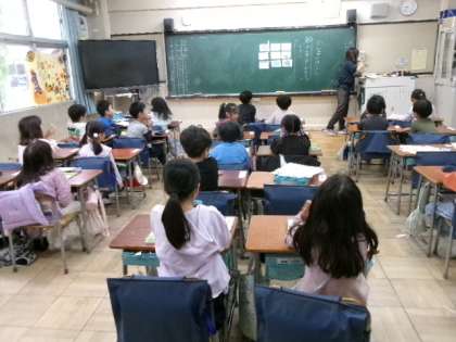 2年生の算数の時間は、「かけ算」です。式や答えの書き方などを確かめながら進めています。
