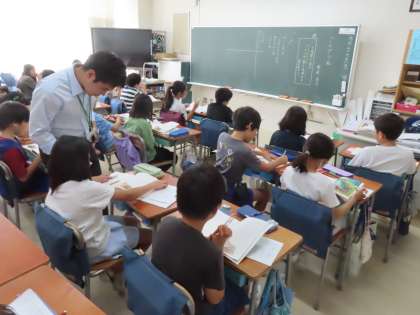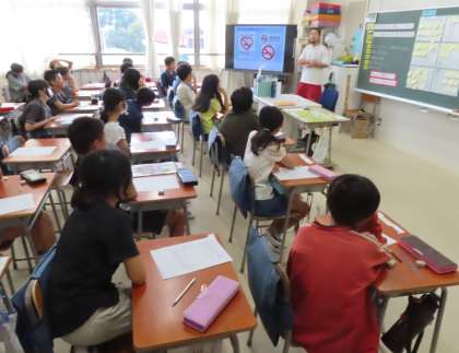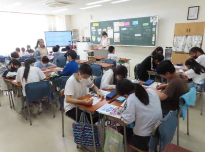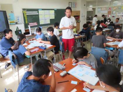 教育実習生による保健学習。虫歯や歯周病を防ぐためにはどうしたらいいか話し合い、わかったことをワークシートにまとめています。