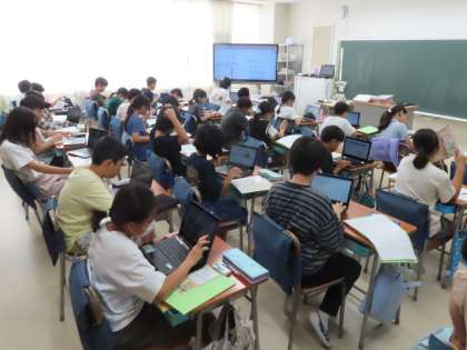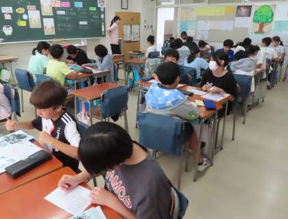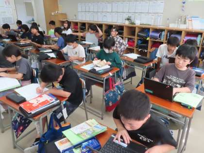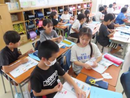 4組も移動教室パンフレットづくりです。体験して学んだことや、感じたことをわかりやすくまとめています。さあ、どんな作品になるかな?