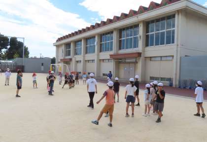 6年生を中心に、校庭では、走り回ったり、ボールを投げたりして遊んでいます。体育館では、4分割の広さで工夫して遊んでいます。