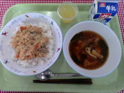・親子丼 ・なめこの味噌汁 ・リンゴゼリー 《ランチタイム》 なめこは、つるっとしたのどごしと、歯ごたえが特徴のキノコです。なめこのぬめり成分には、食物繊維がたくさん入っています。おなかの掃除をしてくれるので、体調を整えることができます。 9/29 たて割り班活動2