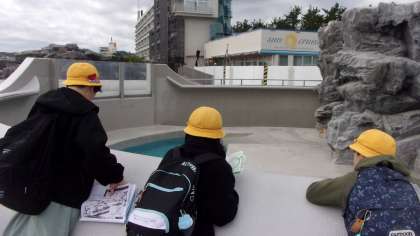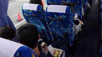 12時20分、千葉ポートパークに到着。小雨が降ってきたため、バスの中でお弁当を食べました。今日は朝が早かったのでお腹がすきました。家族の方が作ってくれたお弁当はとてもおいしかったです。千葉ポートタワーを見ながら、友達と一緒に食べました。食べ終わる頃には雨もあがりました。