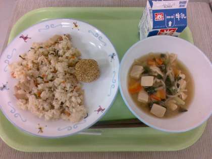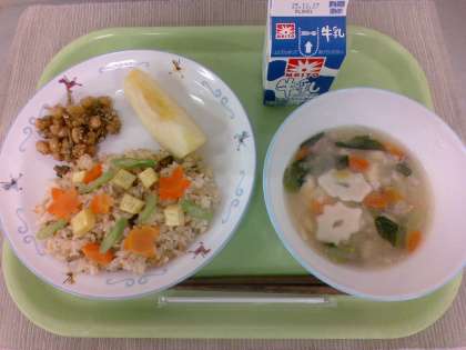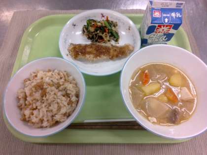 今日の献立は「秋のかおりごはん」「大豆とじゃこの甘唐揚げ」「のっぺい汁」「りんご」です。